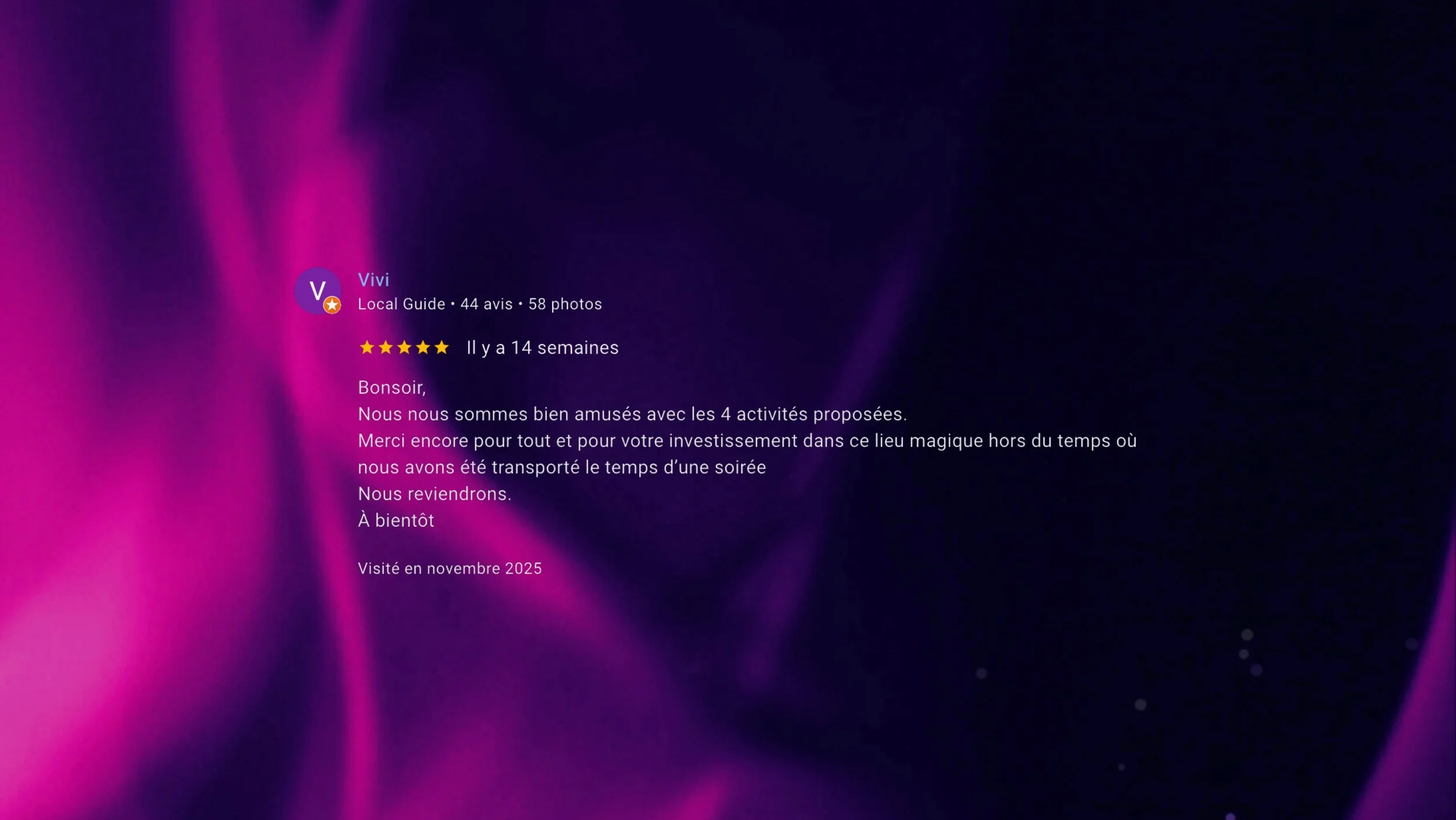 • 👉 LUMIIA est particulièrement adapté à l’accueil de groupes, avec des formats modulables et des expériences pensées pour partager, jouer et vibrer ensemble